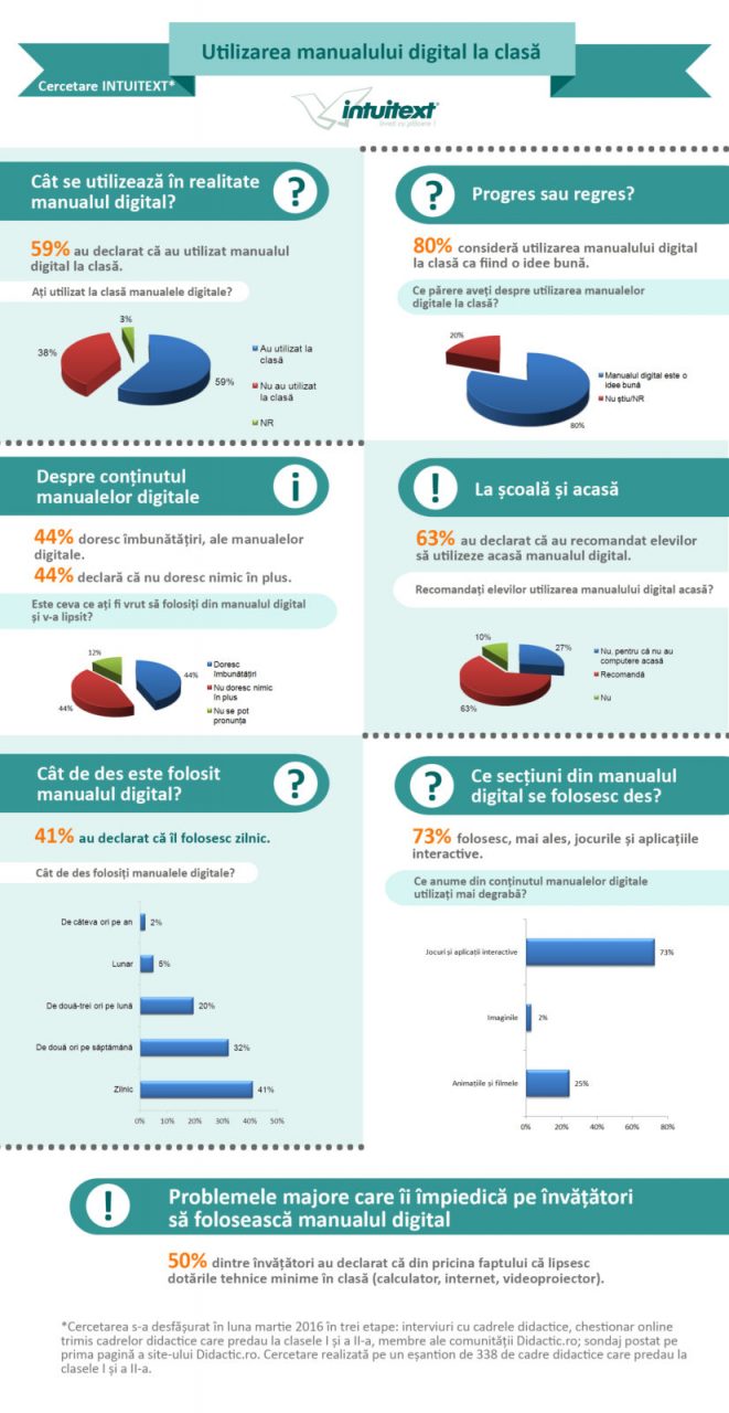 Imagine arrticol manuale digitaleV-ati intrebat vreodata cat de mult sunt folosite manualele digitale in scoli? Prietenii de la Intuitext si-au pus aceasta intrebare la care au incercat sa afle un raspuns printr-un studiu realizat in luna martie. Conform cercetarii* Intuitext, 59% dintre invatatori utilizeaza manualul digital la clasa.