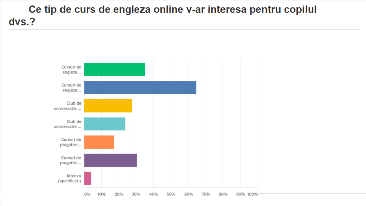 - 65% dintre parinti sunt interesati de cursurile online de engleza generala pentru copii si adolescenti.