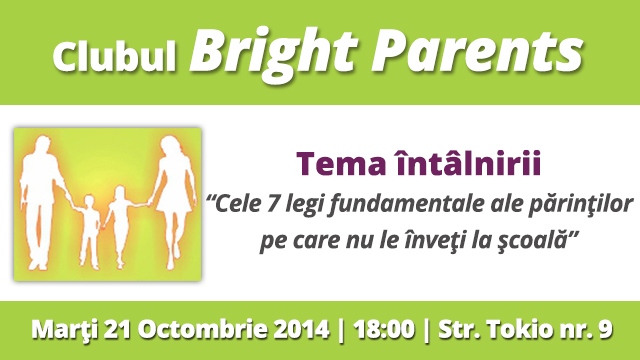 Clubul “Bright Parents”deschide marti, 21 octombrie, seria de intalniri lunare, interactive, ale sezonului de toamna 2014. Invitata noastra, psiholog Mirela Horumba, specialist in consiliere parentala, propune pentru aceasta noua intalnire o tema care poate starni curiozitatea oricarui parinte. Vom afla impreuna care sunt cele 7 legi fundamentale ale parintilor pe care nu le inveti la scoala, cum le putem aplica si cum ne ajuta ele in viata de zi cu zi alaturi de cei mici.
