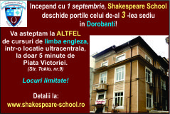Shakespeare School s-a intors din vacanta cu noutati, surprize si mult entuziasm! Inca de la 1 septembrie, de L-V intre 10,00-17,00 ii asteptam pe toti fanii limbii engleze sa se inscrie la cursurile de engleza de an scolar! Vrei sa vezi ce inseamna sa inveti engleza ALTFEL? Daca ai intre 4 si 14 ani, te invitam sa te bucuri de lecţii gratuite de limba engleza! Lectiile demonstrative gratuite vor avea loc la noul sediu Shakespeare School din sectorul 1 al Capitalei- zona Dorobanti incepand de Luni, 12 septembrie.