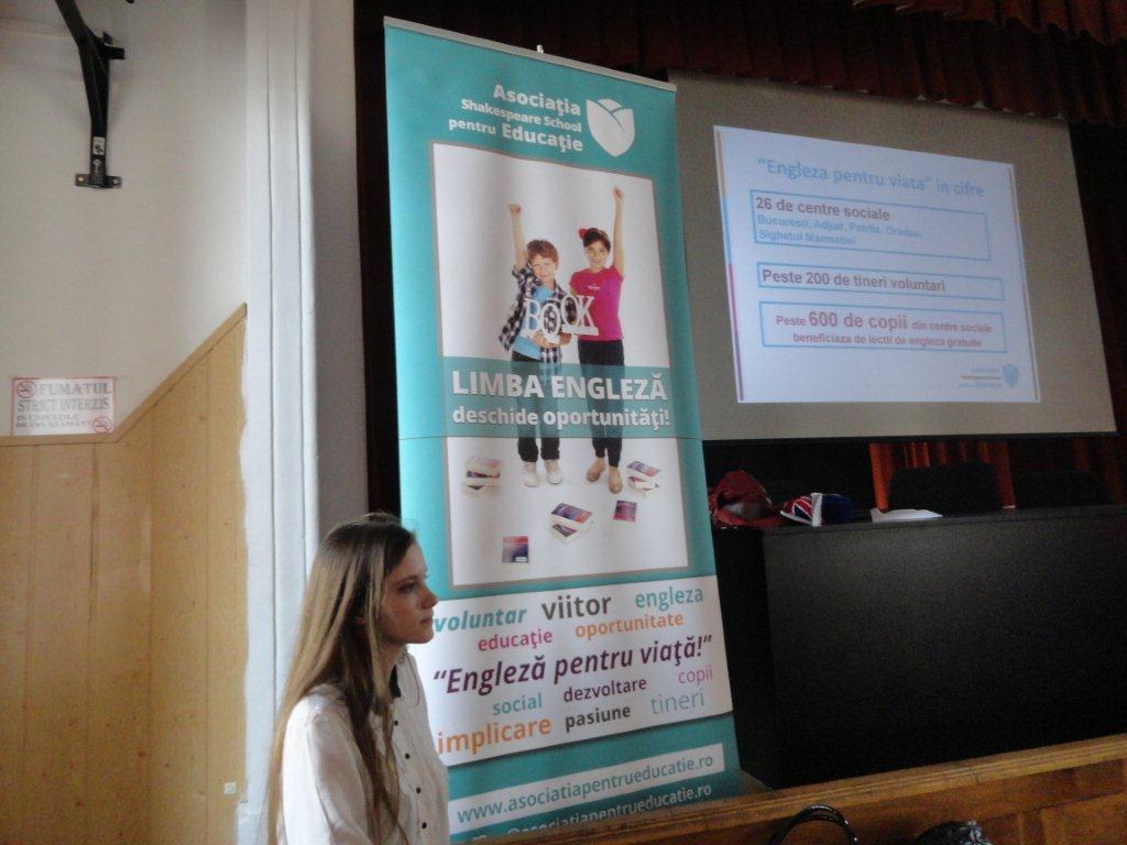 Au luat cuvantul voluntari „Engleza pentru Viata” ce invata la liceul „Gheorghe Lazar” si au povestit despre minunatele lor experiente din centre, despre cat de impliniti se simt dupa fiecare ora si cat de multa bucurie aduc orele de engleza atat copiilor, cat si voluntarilor.