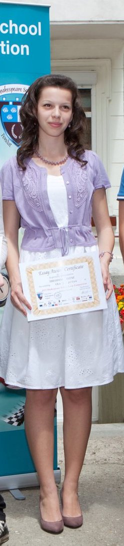 Acest eseu este castigatorul premiului III in cadrul 2011 Shakespeare School Essay Competition, grupa de varsta 15-19 ani, avand ca tema rolul si importanta voluntariatului. Premiul a constat intr-o taxa de examen IELTS sau Cambridge (FCE, CAE, CPE), oferita de British Council, un curs intensiv de vara de limba engleza de 3 saptamani gratuit la Shakespeare School, un cadou surpriza din partea librariei Carturesti, card de reducere oferit de Puma. Dorim sa o felicitam pe Theodora pentru faptul ca s-a evidentiat din peste 5100 de eseuri trimise la concursul national de creatie in limba engleza organizat de Shakespeare School si ii uram mult succes in continuare!