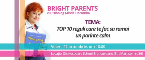 Dragi parinti, Va invitam VINERI, 27 octombrie, incepand cu ora 18:00, la o noua intalnire interactiva, cu participare gratuita, a Clubului “Bright Parents”.
